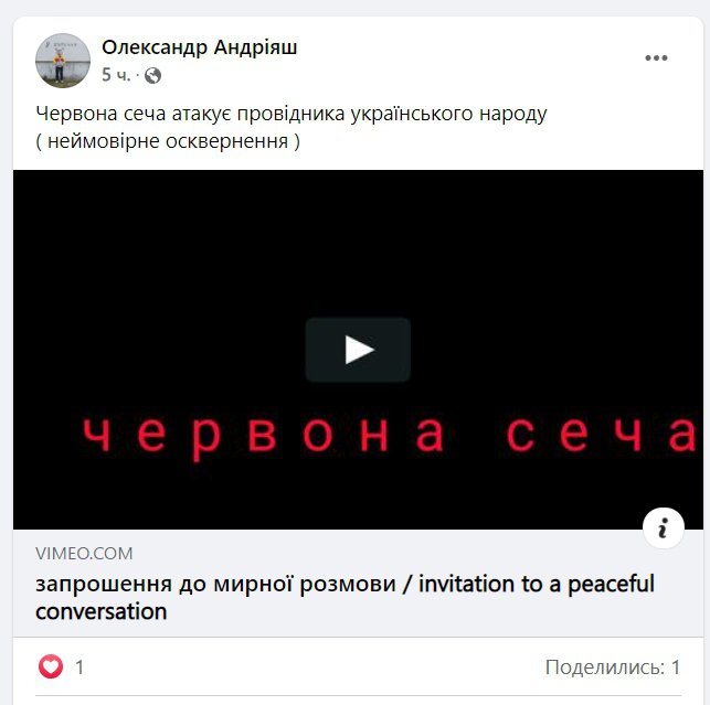 Автор ролика запостил видео со страницы пользовательницы Натальи Деревянко на Vimeo с подписью: "Красная моча атакует проводника украинского народа (невероятное осквернение)". Однако сейчас он его уже удалил.