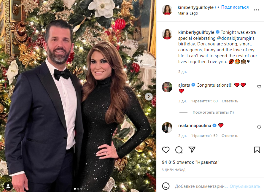 Доказательством помолвки стало опубликованное в сети фото с празднования Нового года и дня рождения Дональда, которому 31 декабря исполнилось 44 года. На снимках хорошо видно кольцо с большим бриллиантом на пальце Кимберли. Также она сделала подпись под своим постом.