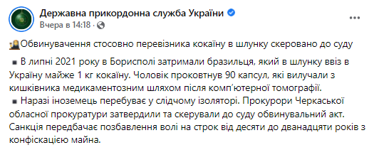 "В июле 2021 года в Борисполе был задержан бразилец, который в желудке ввез в Украину почти 1 кг кокаина. Мужчина проглотил 90 капсул, которые извлекали из кишечника медикаментозным путем после компьютерной томографии", - говорится в сообщении.