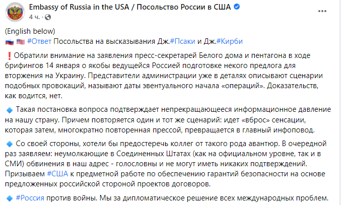 "Представители администрации (Белого дома - Ред.) уже в деталях описывают сценарии подобных провокаций, называют даты эвентуального начала "операций". Доказательств, как водится, нет. Повторяется один и тот же сценарий: идет "вброс" сенсации, которая затем, многократно повторенная прессой, превращается в главный инфоповод", - отметило посольство.