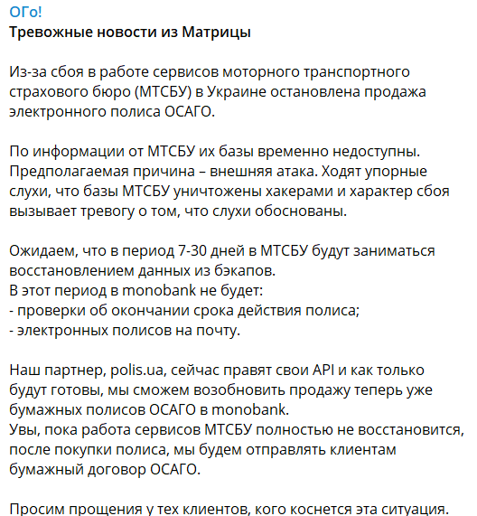 В Монобанке сообщили, что теперь в моторном бюро 7-30 дней будут заниматься восстановлением данных. А его основатель Олег Гороховский предположил, что базы пользователей вообще стерты.