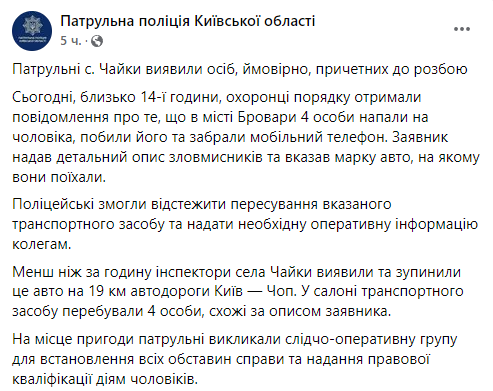 Инцидент произошел около 14 часов, стражи порядка получили сообщение о том, что в городе Бровары 4четыре человека напали на мужчину, избив его и забрав мобильный телефон.