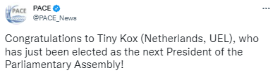 Результаты голосования были объявлены на первом заседании зимней сессии ПАСЕ в Страсбурге, а пресс-служба Парламентской ассамблеи Совета Европы в Twitter поздравила Тини Кокса в новой должностью.