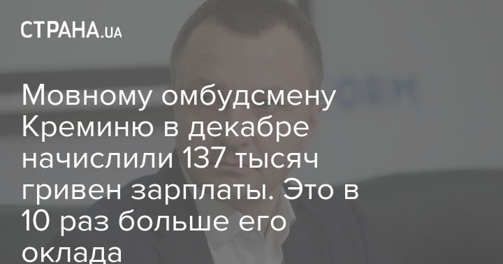 В декабре мовному омбудсмену Тарасу Креминю начислили 137 тысяч гривен зарплаты. Это в 10 раз больше, чем его должностной оклад, размер которого составляет 13 тысяч гривен.