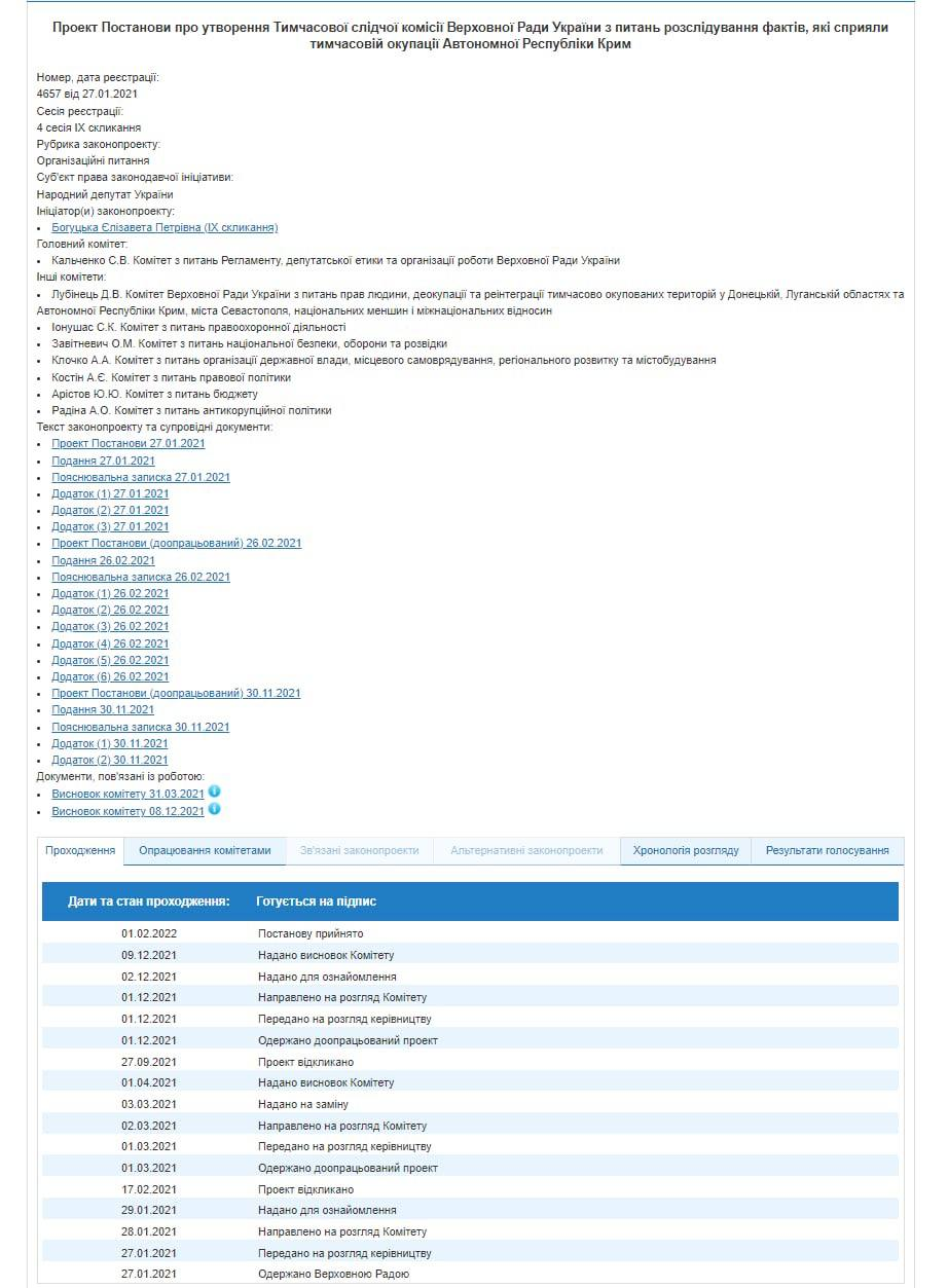 Проект постановления о создании временной следственной комиссии (ВСК) по вопросам расследования фактов, которые способствовали временной оккупации Крыма, Комитет по вопросам регламента, депутатской этики и организации работы Верховной Рады Украины поддержал еще в марте прошлого года. Соответствующий проект постановления нардеп Елизавета Богуцкая внесла на рассмотрение 27 января 2021 года.