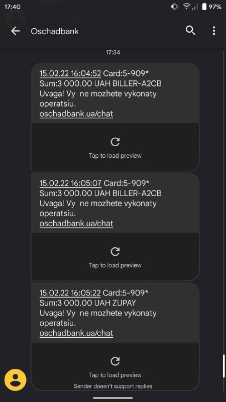 В работе Ощадбанка вечером 15 февраля также были сбои. Не работал интернет-банкинг. После транзакции на смартфон приходило сообщение о том, что клиент не может выполнить операцию.