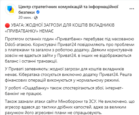 Центр стратегической коммуникации и информационной безопасности СНБО заявил о DDoS-атаках на сайты перечисленных военных ведомств и банков.