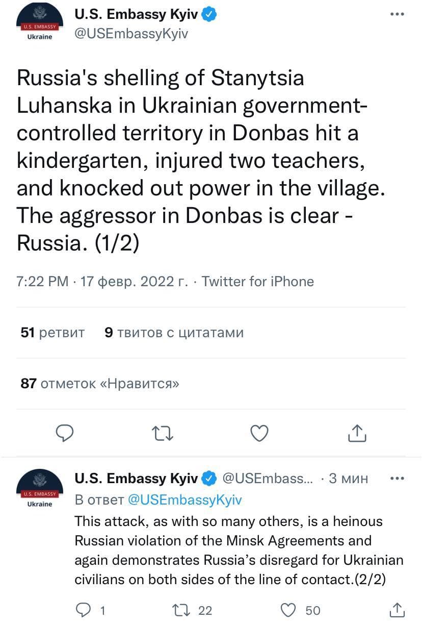 Посольство Соединенных Штатов Америки в Украине назвало Российскую Федерацию агрессором после обстрела населенного пункта Станица Луганская. В своем заявлении американское дипломатическое ведомство назвало обстрел - "российским".