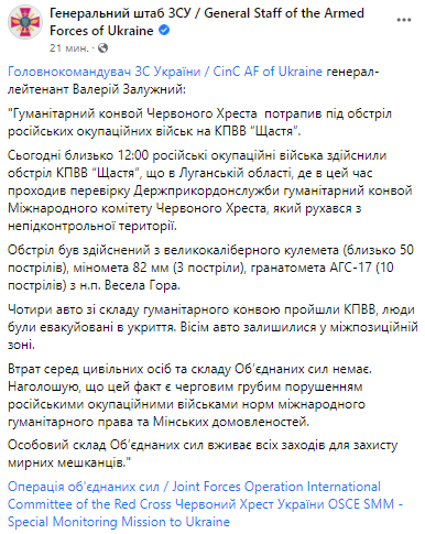 "Сегодня около 12:00 российские оккупационные войска обстреляли КПВВ Счастье, который находится в Луганской области, в это время там проходила проверку Госпогранслужба гуманитарного конвоя Международного комитета Красного Креста, которая покидала неподконтрольную территорию", - говорится в сообщении.
