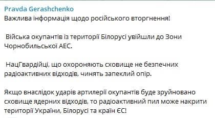 Если в результате ударов артиллерии оккупантов будет разрушено хранилище ядерных отходов, то радиоактивную пыль может накрыть территории Украины, Беларуси и стран ЕС!"