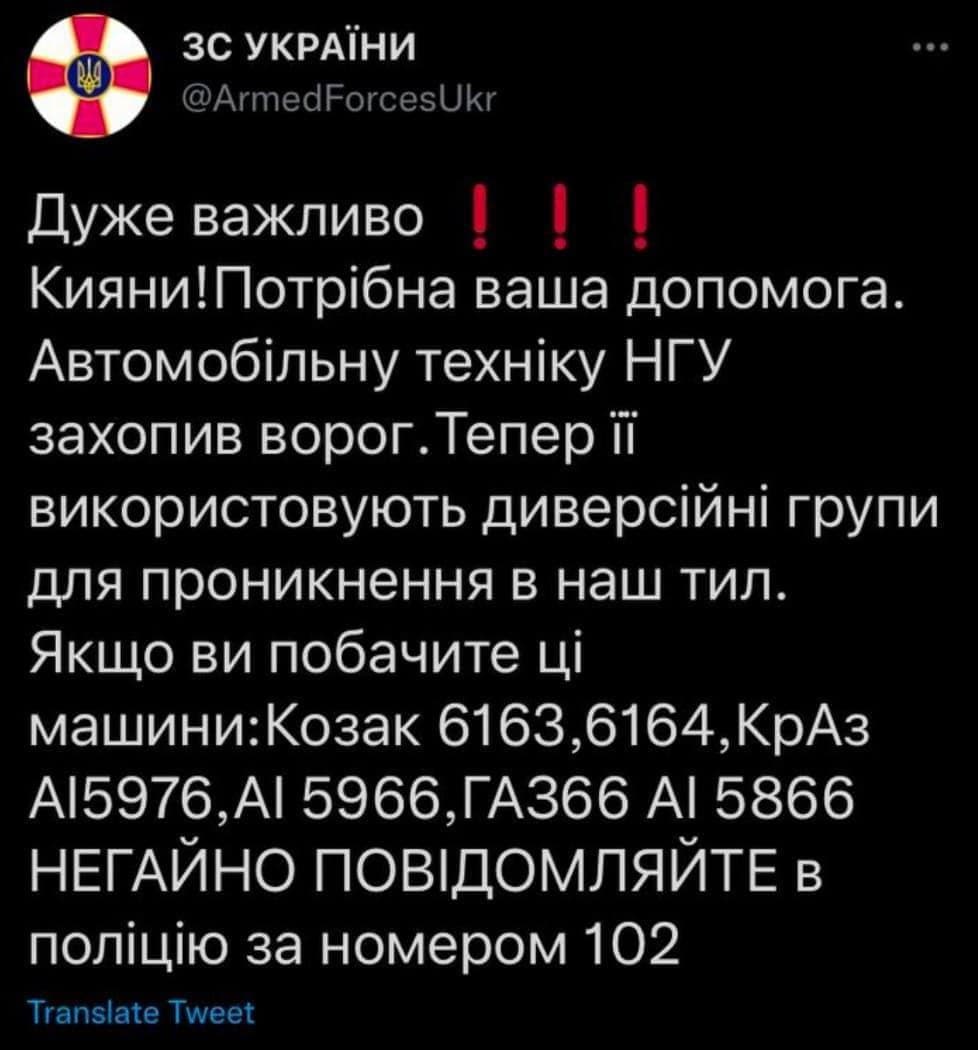 "Киевляне, нужна ваша помощь. Автомобильную технику НГУ захватил враг. Теперь ее используют для проникновения в наш тыл. Если вы увидите машины Козак 6163, 6164, КРАЗ, АИ 5976, АИ 5966, ГАЗ 366, АИ 5866 немедленно сообщите в полицию за номером 102", - заявили в ВСУ.