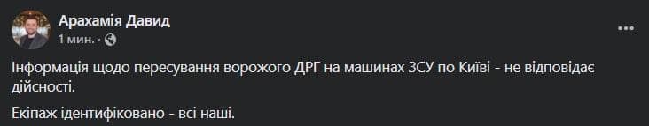 Глава фракции "Слуга народа" Давид Арахамия опровергает, что по Киеву передвигалась российская ДРГ на машинах ВСУ. Говорит, что это украинские военные.