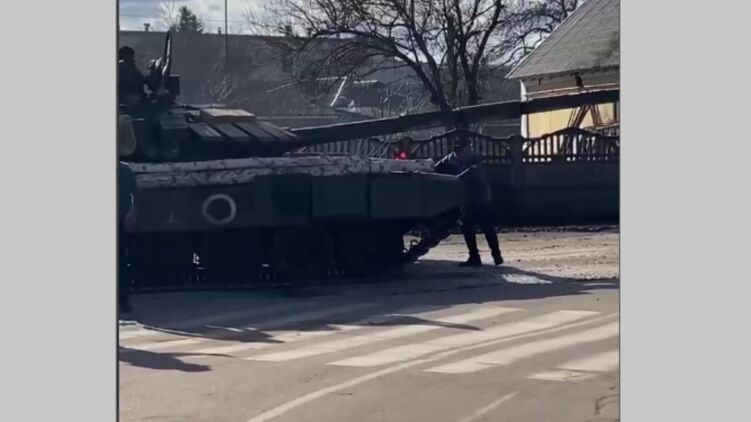 Один из мужчин пытался перекрыть дорогу танкам своим телом. Однако силы оказались не равны, и российская техника смогла проехать дальше.