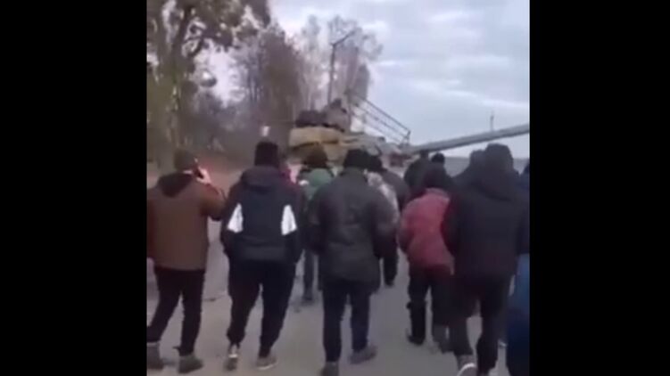 Под Черниговом в городе Корюковка местные люди вышли на улицу, чтобы остановить колонну российских танков. На видео видно, как десятки людей блокируют продвижение танков.
