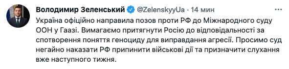 "Украина официально направила иск против России в Международный суд ООН в Гааге. Требуем притянуть Россию к ответственности за извращение понятие геноцида для оправдания агрессии", - говорится в сообщении.