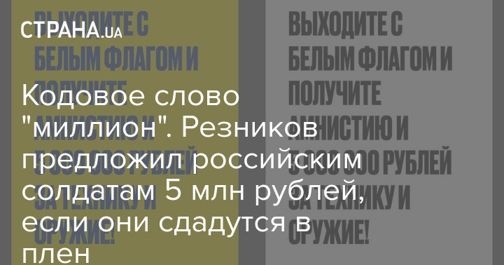 Министр обороны Алексей Резников опубликовал воззвание к российским солдатам. За сдачу в плен он предлагает 5 миллионов рублей. Об этом он написал на своей странице в Facebook.
