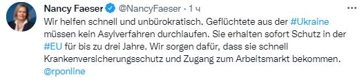 "Помогаем быстро и без бюрократических проволочек. Беженцы из Украины не должны проходить процедуру предоставления убежища. Вы получаете немедленную защиту в ЕС на срок до трех лет. Мы заботимся о том, чтобы они быстро получили медицинскую страховку и доступ к рынку труда" - написала глава МВД.