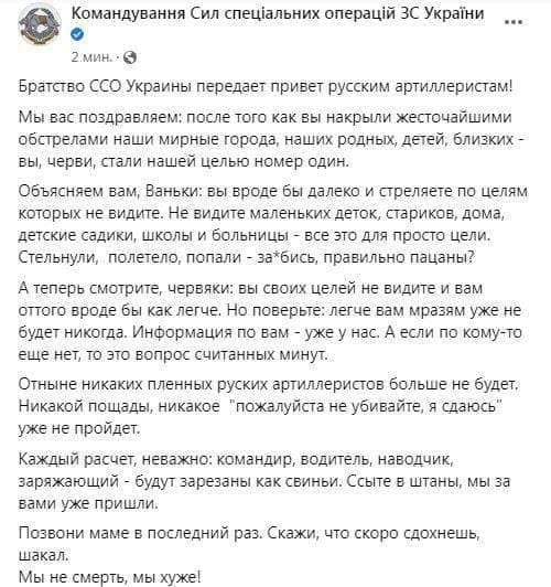 Силы специальных операций Украины обещают не брать живыми в плен российских артиллеристов. Об этом сообщает командование сил специальных операций ВСУ в Facebook.