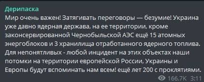 "Мир очень важен! Затягивать переговоры - безумие! Украина уже давно ядерная держава, на ее территории, кроме законсервированной Чернобыльской АЭС ещё 15 атомных энергоблоков и 3 хранилища отработанного ядерного топлива. Для непонятливых - любой инцидент на этих объектах наши потомки на территории европейской России, Украины и Европы будут вспоминать нам всем! Ещё лет 200 с проклятиями", - заявил олигарх.