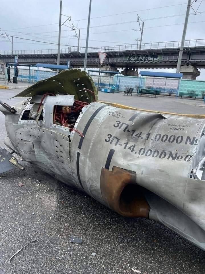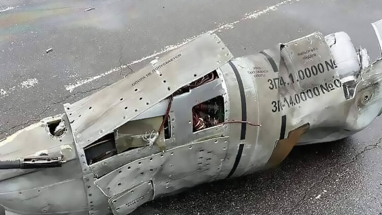 Украинская система противовоздушной обороны сбила над Киевом ракету 3П-14.1.0000 (номер неизвестен, из повреждений надпись видно не полностью).
