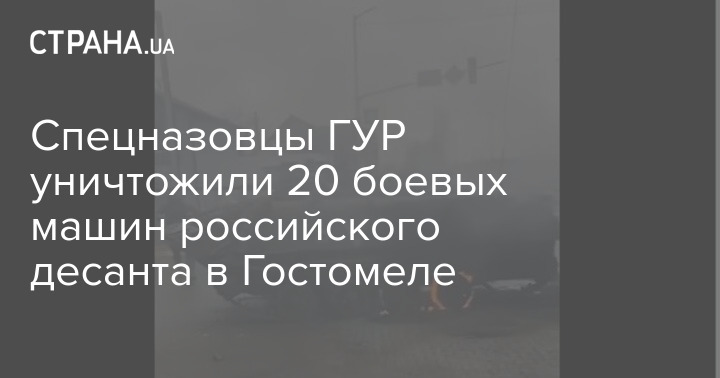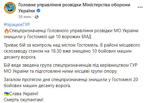 Бой ведет сведенная группа спецназовцев под руководством ГУР МО Украины и подготовленные местными группами сопротивления. Всего в течение дня спецназовцы уничтожили в Гостомеле 20 боевых машин десанта врага" - говорится в сообщении.