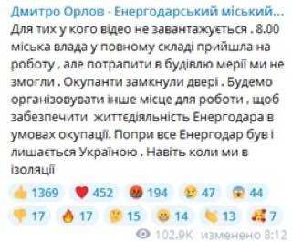 В Энергодаре, куда вчера зашли российские войска, сотрудников мэрии утром 5 марта не пустили в здание горсовета.