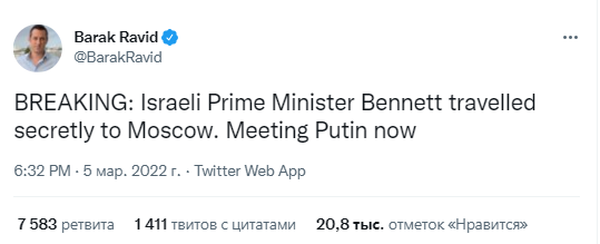 В Москву ради встречи с президентом РФ Владимиром Путиным тайно приехал премьер-министр Израиля Нафтали Беннет. Об этом сообщил журналист Барак Равид в Twitter, также информацию подтвердил спикер Кремля Дмитрий Песков.
