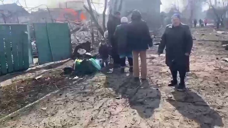 В сети опубликовано видео, на котором видны разрушенные и догорающие жилые дома. Рядом с руинами стоит семья с маленькими детьми.