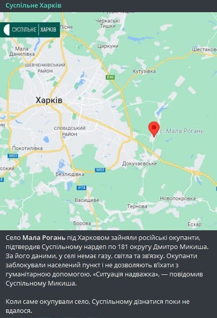 Село Малая Рогань под Харьковом заняли россияне. Об этом сообщает "Суспильне" со ссылкой на информацию нардепа по 181 округу Дмитрия Микиша.