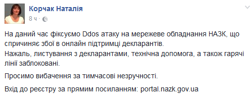 Также глава НАПК сообщила, что ведомству удалось восстановить работу интернет-канала системы е-декларирования. «Техническая поддержка и горячая линия для декларантов тоже восстанавливают свою работу», - подчеркнула Корчак.