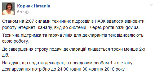 "Сегодня Госспецсвязь доложил, что система работает, но технические службы НАПК состоянию на эту минуту фиксируют, что нагрузка на серверное оборудование, которое обеспечивает принятия, обработки и накопления информации системы электронного декларирования составляет не более 10%", - говорится в сообщении.