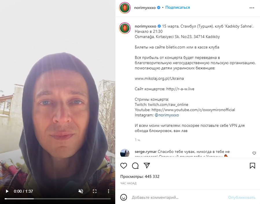 Сегодня, 11 марта, российский рэпер Оксимирон (Мирон Фёдоров - Ред.) заявил, что проведет серию благотворительных концертов "Russians against war".