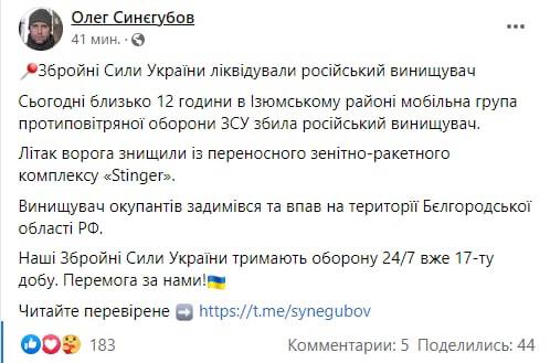 "Вооруженные силы Украины устранили российский истребитель. Сегодня около 12 часов в Изюмском районе мобильная оборонная группа вооруженных сил сбила российский истребитель. Самолет врага разрушили из портативного переносного зенитно-ракетного комплекса Stinger. Истребитель оккупантов задымился и упал на территорию Белгородской области Российской Федерации", - сообщил Синегубов.