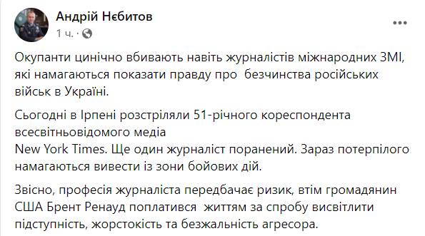 "Сейчас потерпевшего пытаются вывести из зоны боевых действий. Конечно, профессия журналиста предполагает риск, впрочем, гражданин США Брент Ренауд поплатился жизнью за попытку осветить коварство, жестокость и безжалостность агрессора", - написал глава ведомства.
