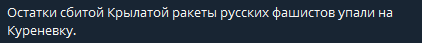 "Остатки сбитой Крылатой ракеты русских фашистов упали на Куреневку", - написал он.