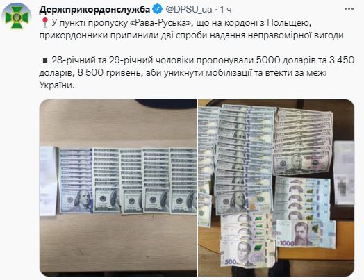 "Предлагали 5 000 долларов и 3 450 долларов, 8500 гривен, чтобы избежать мобилизации и убежать за пределы Украины" сообщили пограничники.