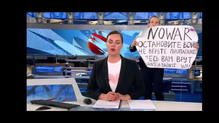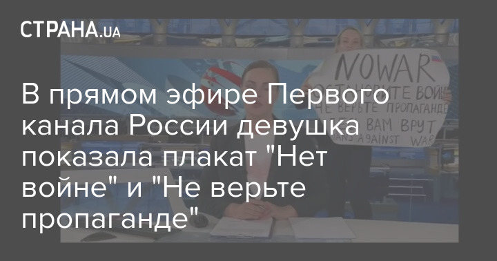 На российском федеральном "Первом канале" в прямом эфире выпуска новостей "Время" девушка вышла с плакатом "Нет войне".