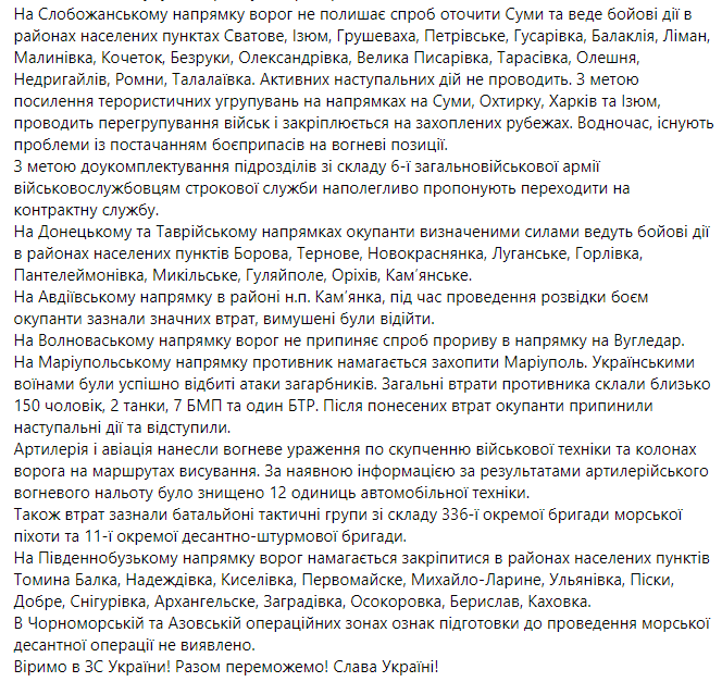 • На Слобожанском направлении враг не оставляет попыток окружить Сумы и ведет боевые действия в районах населенных пунктах Сватово, Изюм, Грушеваха, Петровское, Гусаровка, Балаклея, Лиман, Малиновка, Кочеток, Безруки, Александровка, Великая Писаревка, Тарасовка, Олешня, Талалаевка. Чтобы продолжить наступление на Сумы, Ахтырку, Харьков и Изюм враг проводит перегруппировку войск и закрепляется на захваченных рубежах. Однако у российских войск есть проблемы со снабжением боеприпасами на огневые позиции.