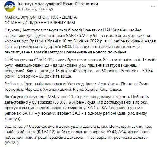 В Институте молекулярной биологии и генетики НАН Украины, проанализировав 93 образца из 11 регионов, тоже подтвердили наличие подвида ВА.2.