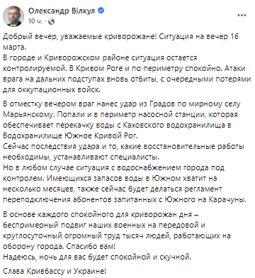 "Вечером враг нанес удар из "Градов" по мирному селу Марьянскому. Попали и в периметр насосной станции, которая обеспечивает перекачку воды с Каховского водохранилища в водохранилище "Южное Кривой Рог", - написал Вилкул.