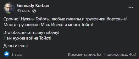 "Нужны "Тойоты", любые пикапы и грузовики бортовые! Много грузовиков "Ман", "Ивеко" и много "Тойот"! Это обеспечит нашу победу! Нам нужна война "Тойот"!" - написал Корбан.