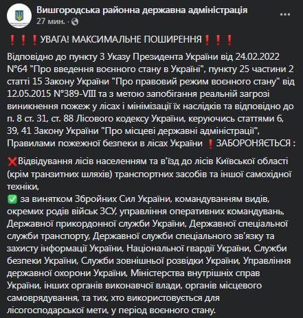 Во время военного положения леса разрешено посещать лишь представителям ВСУ, Госпогранслужбы, Государственной специальной службы транспорта, Государственной службы специальной связи и защиты информации Украины, Нацгвардии, СБУ, СВР, УГО, МВД, других органов исполнительной власти, органов местного самоуправления и тем, кто работает в лесном хозяйстве.
