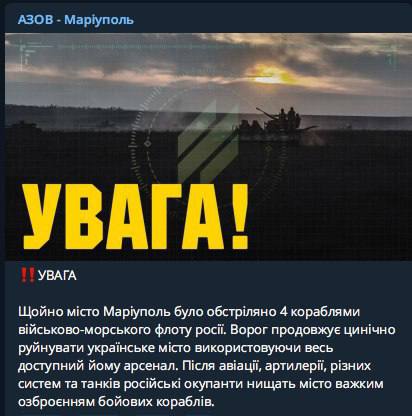"Только что Мариуполь был обстрелян 4 кораблями военно-морского флота России. Враг продолжает цинично уничтожать украинский город, используя весь доступный ему арсенал. После авиации, артиллерии, разных систем и танков российское оккупанты уничтожают город тяжелым вооружением боевых кораблей", - говорится в сообщении.