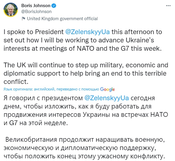 "Сегодня днем, чтобы изложить, как я буду работать над продвижением интересов Украины на встречах НАТО и G7 на этой неделе. Великобритания продолжит наращивать военную, экономическую и дипломатическую поддержку, чтобы положить конец этому ужасному конфликту", - написал премьер.