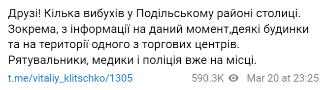 "По информации на данный момент повреждены некоторые дома и территория одного из торговых центров. Спасатели, медики и полиция уже на месте", - написал Кличко.