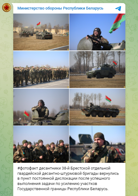 В Беларуси десантники 38-й Брестской отдельной гвардейской десантно-штурмовой бригады вернулись от украинской границы к пункту постоянной дислокации.