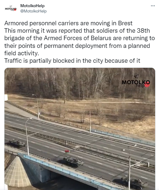 По данным ресурса "Мотолько Хелп", который занимается мониторингом передвижения белорусских войск, БТРы движутся по Бресту - из-за этого в городе частично перекрыто движение.
