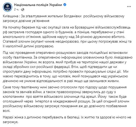 "По оперативной информации подонок был ликвидирован военными Украины, как враг, прибывший на территорию нашего государства в составе вооруженных сил Российской Федерации. Впрочем, чтобы подтвердить это или опровергнуть данную информацию, необходимо провести процессуальные следственные действия. Мы должны убедиться в том, что урод, который поиздевался над украинской девушкой, не избежит ответственности в случае, если еще остался жив", - рассказали в полиции Киевской области.