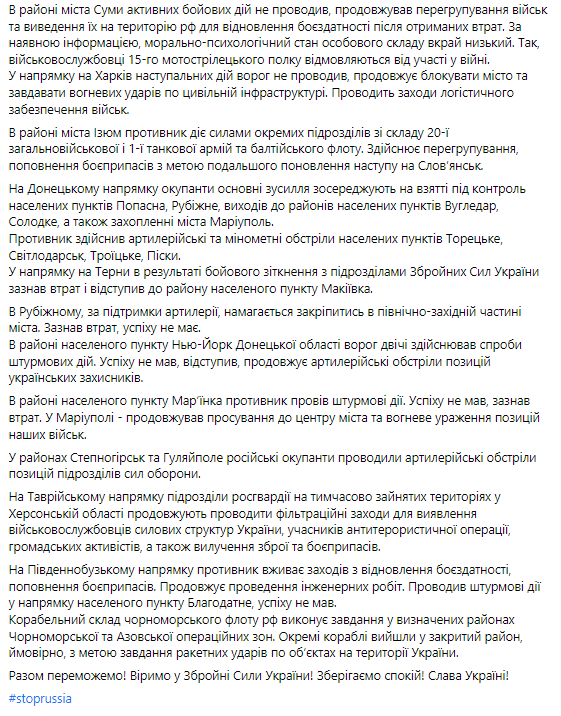 Также в дневной сводке сообщается, что сейчас основные усилия враг сосредотачивает на удержании занятых рубежей и подготовке к возобновлению наступательных действий.