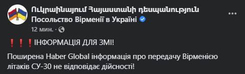 При этом посольство Армении в Украине уточнило, что данная информация не соответствует действительности.